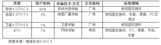根據不同傳輸方式,中國DTV主要分為有線數字電視、地麵數字電視、衛星數字電視以及IPTV四種類型。(傳統意義上數字電視分有線、地麵及衛星三種類型。但AVC認為,從應用角度來講,IPTV是數字電視的一種特殊表現形式,故將IPTV也列入比較之列)
