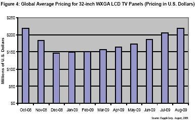2008 年10 月至2009 年8 月32-inch WXGA LCD 麵板的全球平均價格。
