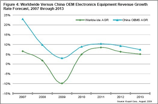 根據iSuppli公司的分析,2008年中國國內電子OEM廠商的營業收入增長了9.8%,達到1480億美元,遠高於同期全球市場1.8%的增長率。iSuppli公司預測,中國的整體電子營業收入將繼續增長,到2013年將達到2140億美元,複合年增長率為8.2%。