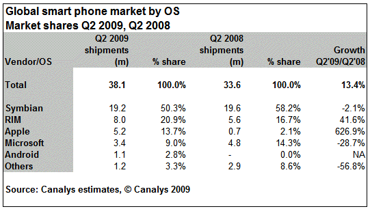 根據操作係統所統計的第二季全球智能手機市場份額中,Symbian係統智能手機銷量為1920萬部,同比減少2.1%,占整體智能手機銷量的52%;RIM操作係統智能手機銷量為800萬部,同比增長了41.6%;蘋果操作係統手機銷量為520萬部,同步增長626.9%;微軟操作係統手機銷量為340萬部,同比下降28.7%;穀歌Android操作係統手機銷量為110萬部。