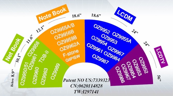 基於這樣的技術積累,目前凹凸科技已成為擁有最廣泛LCD背光驅動IC產品線的廠商,如圖1所示,從上網本到筆記本電腦再到LCD顯示器模塊、LCD TV,尺寸從8.9吋橫跨到56吋,凹凸科技能提供滿足各類應用需的相應LED驅動器解決方案(具備不同的效率等級、PWM接口、不同通道數),包括3x9、4x7、4x8、6x10、8x8、8x9等不同配置。多種技術特性如集成高速PWM功能、采用快速切換的開關模式、突波模式與相移技術,及其專有的區域照明等技術,則可幫助開發人員解決多串數LED均流、LED線性調光所產生的噪聲、功率耗散,以及廠商對於保護規格要求不一等挑戰。