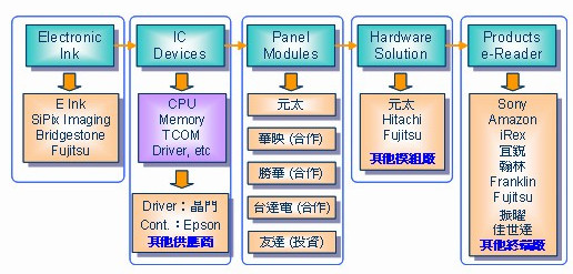 除此之外,國際電子紙技術大廠Bridgestone及Fujitsu也嗅到與台灣廠商合作的新機會,Bridgestone將與台達電攜手合作開發、生產電子紙應用產品,Fujitsu也有意來台設置膽固醇液晶式電子紙Film材料前段製程生產線與研發中心,可預見的是,全球電子紙技術四大天王彙聚在台灣將促使台灣成為電子紙產業發展中心。