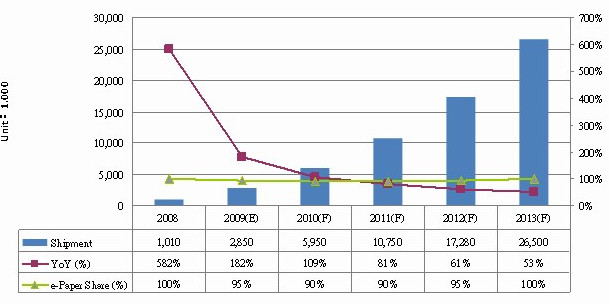 由於電子紙潛在市場可觀,加上全球電子書銷售量持續增長,更為電子紙的應用注入強心劑。根據Andrew Tribute研究數據指出,全球電子書內容銷售量每月約為40萬本,預估2010年數字數據的產量將與紙本數據平分秋色,2020年數字數據的市場占有率更達65%,數字出版增長動能大增,各式電子閱讀器也紛紛出籠,勢不可擋。