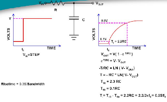 至此,我們知道帶寬f2即輸出電壓降低到輸入電壓70.7%時的頻率點。 根據放大器的等效模型,我們可進一步推導示波器的上升時間和帶寬的關係式,即我們常提到的0.35的關係:上升時間=0.35/帶寬,推導過程如下圖6所示。 需要說明的是,0.35是基於高斯響應的理論值,實際測量係統中這個數值往往介於0.35-0.45之間。在示波器的datasheet上都會標明“上升時間”指標。 示波器測量出來的上升時間與真實的上升時間之間存在下麵的關係式。 在對快沿信號測試中,需要通過該關係式來修正實際被測信號的上升時間。