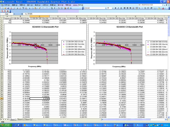 此外,在計量波特圖時需要對示波器每個檔位都進行計量,最終產生的波特圖是所有檔位的結果疊加在一起的。波特圖的計量是需要半天時間完成的,並不是想象中那麼輕鬆的工作。如圖8所示是力科SDA9000的波特圖,我特地將Excel中大量數據顯示給大家以使大家對校準的嚴謹性有深刻認識。 其垂直軸是-1dB/div, 疊加了10mv/div、20mv/div、50mv/div、200mv/div、500mv/div、1v/div等檔位的測試結果。 很多時候,我們的競爭對手會把他們的波特圖畫成-10dB/div、隻有一個檔位的測試結果拿給客戶,並和力科提供的這種-1dB/div、gezhongdangweidiezaiyiqixianshidejieguofangzaiyiqijinxingduibi,ranhoutamengaosukehu,tamendebotetugengpingtan,gengganjing,shenzhijianglikebotetushangmianmimimamadedianshuochengshi“噪音”大。這是有點貽笑天下的。 競jing爭zheng對dui手shou敢gan於yu一yi再zai采cai用yong這zhe種zhong做zuo法fa,這zhe是shi假jia設she中zhong國guo的de工gong程cheng師shi都dou沒mei有you辨bian別bie力li,獨du立li思si考kao能neng力li,是shi對dui工gong程cheng師shi嚴yan重zhong不bu尊zun重zhong的de公gong然ran欺qi騙pian行xing為wei。希xi望wang能neng引yin起qi大da家jia注zhu意yi。