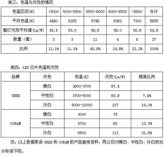 眾所周知,LED路燈的光效與色溫密切相關。從表四可看出,GREE芯片不同色溫的光效差別不大,但OSRAM芯片則不然,不同色溫的光效差別較大,6500K芯片比5700K芯片光效提高31.8%。因此,LEDludengbixuzaisewenyuguangxiaozhijianqudepingheng,jiyaochongfenkaolvshimindeshushiganhemanyidu,yebunengweizhuiqiudisewenerdafuxishengguangxiao。bijing,zhaoduhegonglvmiduzhishi《城市道路照明設計標準》(CJJ45-2006)的硬指標,必須有較高光效才能滿足要求。同時,由於不同色溫芯片的價格差別較大,成本因素也需要認真考慮。