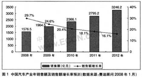 中國汽車產業的繁榮直接帶動了汽車電子產業的迅速崛起。中國汽車產業近幾年快速發展,2007年產量達到近888.24萬部,僅次於日本和美國,成為世界第三大汽車生產國。下遊應用市場的快速增長對汽車電子產業的發展起到巨大的推動作用。