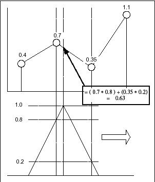隨著窗口滑到右麵,通過把窗口值之和乘以窗口和樣點相交時的實際樣點值,得到內插點。內插的樣點放在窗口頂點時間上。