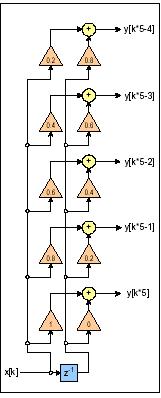 通過使用過采樣排列的數字濾波器,也可以實現這種卷積。圖中所示的排列是一個5點過采樣器。在這一排列中,每個新樣點都生成5個新樣點。濾波器輸出僅與新輸入和最後一個輸入有關。濾波係數通過對窗口采樣生成。