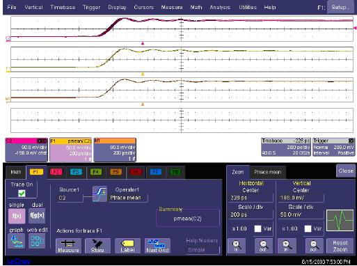 這張圖片說明了在WaveMaster示波器中怎樣測試SinX內插的有效性。在這種情況下,它把重複的信號應用到通道2,啟動餘輝,使SinX內插失效。F1定義為通道2的餘輝曲線中間值。隨著時間推移,餘輝曲線被填充,Ptrace中間值函數生成輸入模擬波形的清楚圖片。F1保存到存儲器M1中,成為參考曲線。