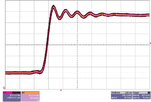 M1留在屏幕上作為參考,F1關閉,通道2上啟動SinX內插。示波器重複觸發,生成重複采集的波形及內插樣點的新餘輝曲線。由於新餘輝地圖在本質上是參考源的確切複現(幾乎看不到,位於餘輝曲線的中心),測試結果表明,在這些情況下,適合使用SinX內插。同時,由於應用的邊沿非常快,可以得出結論,在以20 GS/s最大采樣率運行時,WaveMaster 8620A將一直提供適當的SinX內插,而不管應用的輸入信號是什麼。