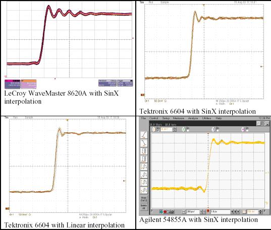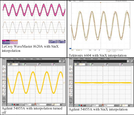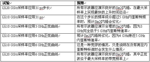 我們使用三種競爭的DSO進行簡單的試驗,其分別是力科Wavemaster 8620A、泰克6604和安捷倫54855A。這三種示波器的帶寬指標都是6 GHz,最大采樣率是20 GS/s。我們使用六種不同的信號和采樣率組合,說明SinX內插算法的性能。