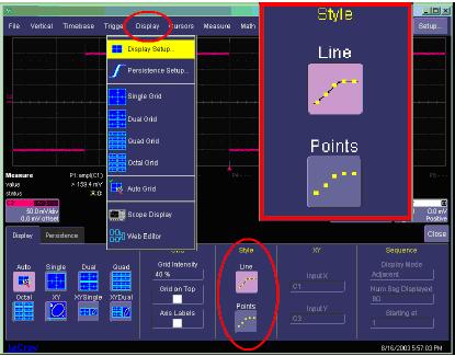 顯(xian)示(shi)畫(hua)麵(mian)可(ke)以(yi)設(she)置(zhi)成(cheng)隻(zhi)顯(xian)示(shi)點(dian)或(huo)直(zhi)線(xian)。在(zai)選(xuan)擇(ze)點(dian)時(shi),將(jiang)隻(zhi)顯(xian)示(shi)波(bo)形(xing)點(dian),包(bao)括(kuo)任(ren)何(he)內(nei)插(cha)的(de)點(dian)。在(zai)選(xuan)擇(ze)直(zhi)線(xian)時(shi),會(hui)在(zai)每(mei)個(ge)波(bo)形(xing)點(dian)之(zhi)間(jian)畫(hua)一(yi)條(tiao)直(zhi)線(xian),僅(jin)包(bao)括(kuo)顯(xian)示(shi)畫(hua)麵(mian)上(shang)內(nei)插(cha)的(de)點(dian)。