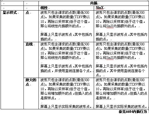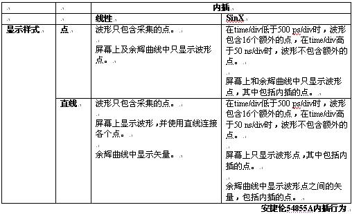 下表詳細介紹了在WaveMaster上怎樣應用內插及怎樣顯示波形的規則。