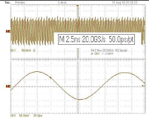安捷倫示波器,20 GS/s、100 ps/div、啟動SinX內插。正弦波看上去很好,測量精度很高。