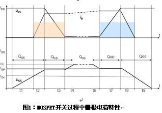 功率MOSFET管的柵極電荷特性如圖1所示,此特性圖可以在MOSFET數據表中查到,開通的工作過程可以參閱相關的文獻。值得注意的是:下麵的開通過程對應著BUCK變換器上管的開通狀態,對於下管是0電壓開通,因此開關損耗很小,可以忽略不計。