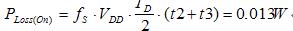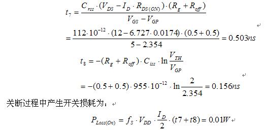 MOSFET開通損耗主要發生t2和t3時間段。下麵以一個具體的實例下計算。輸入電壓12V,輸出電壓3.3V/6A,開關頻率350kHz,PWM柵極驅動器電壓為5V,導通電阻1.5Ohm,關斷的下拉電阻為0.5Ohm,所用的MOSFET為AO4468,具體參數如下:Ciss= 955pF,Coss= 145pF,Crss= 112pF,Rg= 0.5Ohm;當VGS= 4.5V,Qg= 9nC;當VGS=10V,Qg= 17nC,Qgd= 4.7nC,Qgs= 3.4nC;當VGS=5V且ID=11.6A,跨導gFS= 19S;當VDS=VGS且ID=250uA,,VTH= 2V;當VGS= 4.5V且ID=10A,RDS(ON)=17.4mOhm。