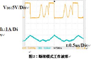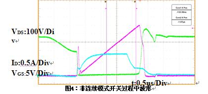 注意到圖1是基於連續電流模式下所得到的波形,對於非連續模式,由於開通前的電流為0,所以,除了Coss放電產生的功耗外,沒有開關的損耗,即非連續模式下開通損耗為0。但在實際的檢測中,非連續模式下仍然可以看到VGS有米勒平台,這主要是由於Coss的放電電流產生的。Coss放電快,持續的時間短,這樣電流迅速降低,由於VGS和ID的受轉移特性的約束,所以當電流突然降低時,VGS也會降低,VGS波形前沿的米勒平台處產生一個下降的凹坑,並伴隨著振蕩。