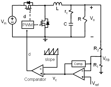 電壓模式的控製係統如圖1所suo示shi。反fan饋kui環huan路lu隻zhi有you一yi個ge電dian壓ya環huan,電dian壓ya外wai環huan包bao括kuo電dian壓ya誤wu差cha放fang大da器qi,反fan饋kui電dian阻zu分fen壓ya器qi和he反fan饋kui補bu償chang環huan節jie。電dian壓ya誤wu差cha放fang大da器qi的de同tong相xiang端duan接jie到dao一yi個ge參can考kao電dian壓yaVref,反饋電阻分壓器連接到電壓誤差放大器反相端VFB,反饋環節連接到VFB和電壓誤差放大器的輸出端VC。輸出電壓微小的變化反映到VFB管腳,VFB管腳電壓與參考電壓的差值被電壓誤差放大器放大,然後輸出,輸出值為VC。