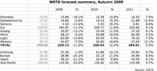 全球半導體貿易統計機構(WSTS)對於2010年各類芯片的展望,有的達兩位數,這是由於前幾個月工業迅速回升。