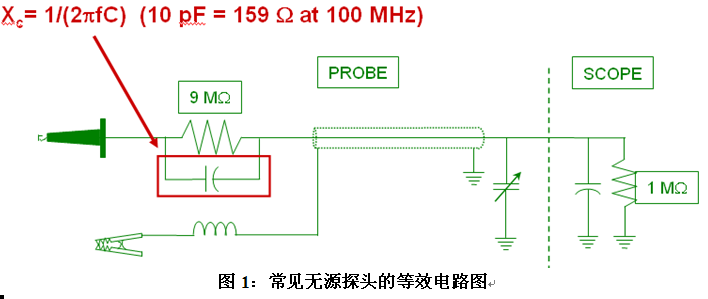 從無源探頭的原理來看,如圖1所示為常見的無源探頭的簡化電路圖,通常示波器標配的無源探頭的直流輸入電阻為10兆歐(探頭的9兆歐與示波器前端1兆歐串聯),輸入電容為10pf左右,與9兆歐電阻並聯。當待測試信號的頻率較高時,容抗隨著頻率升高而減小,所以無源探頭整體的輸入阻抗變小,當頻率為100MHz時,輸入阻抗為159歐。
