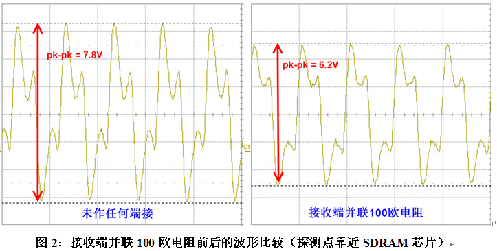 幾天後,我們在實驗室重新測試了該係統的時鍾,測試儀器為SDA816Zi(帶寬16G,采樣率40G),探頭為ZS1500(帶寬1.5GHz)。由於待測試信號頻率僅為100MHz,所以通常1G以上示波器和探頭足以滿足需求(注:對於某些上升時間很快的時鍾,比如PCIExpress的100MHz時鍾,1GHz的帶寬是不夠的,需要更高帶寬的示波器)。下圖2左圖為未作端接時在SDRAM芯片端測量時鍾波形,右圖為靠近SDRAM顆粒並聯100歐電阻後的波形,兩者相比,前者的過衝高達7.8V,電路板不能正常工作;而後者過衝較小,電路板可以正常工作。