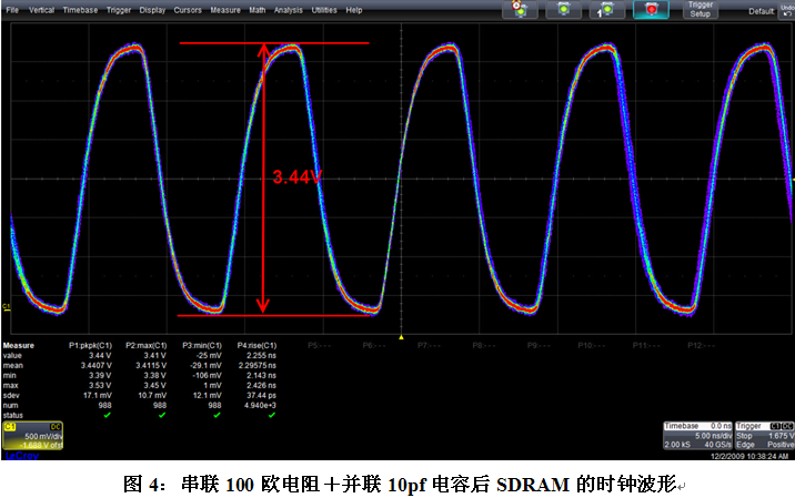 由於電路中ARM的MCU輸出的一路100MHz時鍾要驅動兩個SDRAM芯片,布線上MCU出來的時鍾剛出來就分成兩路後連向兩個SDRAM的時鍾引腳,所以我們采用了在兩路時鍾分支上同時串聯100歐電阻加並聯10pf電容的端接方法。在PCB上割線,焊上電阻和電容後測量的結果如下圖4所示,改進後的時鍾峰峰值為3.44V,波形無過衝,信號質量良好。電路板係統運行正常。