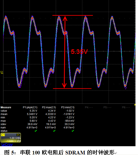下圖5所示為隻串聯100歐電阻時測量到的波形,信號有過衝,峰峰值為5.35V,偏大,對比圖4的端接方法,串聯電阻加上並聯電容是較好的解決方法。