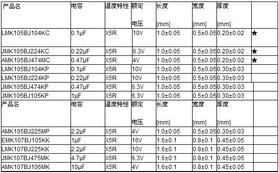 超薄陶瓷電容器的產品線如下:(★:本文介紹的新品)。