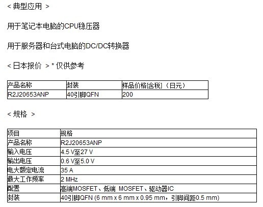 R2J20653ANP:Renesas發布用於筆記本CPU電源的MOSFET