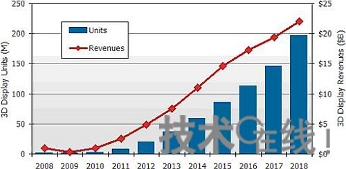 對於3D顯示器的用途,按供貨金額計算,3D電視無疑占最大份額。預測認為,3D電視的供貨量將從2010年的約100萬台增至2013年的約1500萬台。另外,帶有3D功能的手機供貨量在2018年將達到7100萬部,按照數量計算將成為最大的3D顯示器用途。預計3D監視器(2018年將達到1000萬台)和3D筆記本電腦(2018年將達到1770萬部)的供貨量,也將隨著3D內容的亮相而增加。