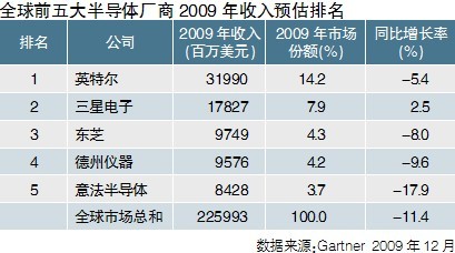 根據市場調研公司Gartner的估計,2009年全球半導體行業總收入為2.26億美元,同比下滑11.4%,這將是該行業25年來經曆的第六次收入下滑。 Gartner分析稱,個人電腦市場是最先反彈的市場,隨後是手機、汽車等市場開始反彈。此外,盡管收入下滑,英特爾仍連續18年蟬聯年收入額第一,2009年,該公司的市場份額增加到14.2%。