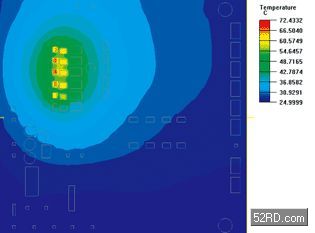 圖1b:原始設計中,在均勻熱流時PCB上表麵的溫度分布情況。