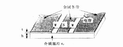 本實驗使用特性阻抗Zc為50Ω的共麵波導作為測試夾具,將待測電容橫跨接在共麵波導的內外金屬條帶之間,其橫截麵圖如圖3所示。並接在共麵波導上的被測電容構成的雙端口網絡如圖4所示。