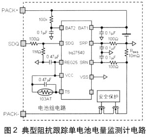 阻抗跟蹤鋰離子單節電池組電路如圖2所示。通過BAT2引腳輸入端測量電池電壓,通過庫侖計數器差動信號輸入端(SRP及SRN)監測電流。係統利用電量監測計從單線SDQ通信端口獲得SOC及運行時間接近結束(Run-Time-to-Empty)等信息。