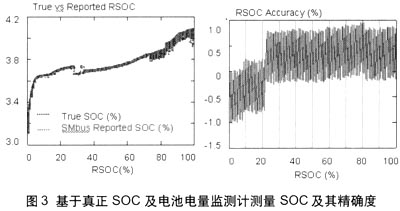 即使在負載變化的情況下,IT電量監測計也能正確預測電池的剩餘電量。例如,數碼相機處於不同工作模式時,電池的負載也不同。圖3顯示了IT電量監測計如何精確預測電池剩餘電量。剩餘電量預測的誤差率可小於1%。並且,由於用以預測剩餘電量的電池阻抗及老化作用能夠得到實時更新,故在電池整個使用壽命內均可保持這種微小誤差。