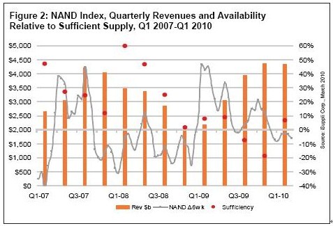 對於2010年上半年,預計營業收入將略低於2009年下半年。iSuppli公司還預測,NAND充足率在今年剩餘時間內將在負10%與負5%之間波動。