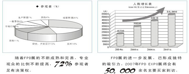 ●“光電平板顯示展”將吸引知名FPD企業的高管(日立、夏普、三星、LG、友達、華映等)、通路商的高管、政府要員、技術人員等近五萬人到場,同時組委會將通過國內外相關行業協會、商會組織專業士參觀。