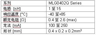 該產品實現了貼片元件的最小尺寸,僅為0402(0.4×0.2×0.2mm)。積層時的位置控製,使用了目前最高精度的新技術。為了提高Q特性,通過優化線圈的形狀設計使其達到最理想狀態,實現了與以往的產品相比,Q特性提高40%。特別用於高頻電路中,高Q特性可以減少損耗,發揮其高效率。在抗阻(0.4~2.6ohm max),額定電流(100~250mA),電感係數(1~15nH)範圍之內,該產品的line-up具備了E12係列的15種,並計劃於2010年5月追加E24係列的12種。