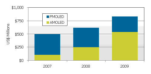 根據DisplaySearch最新出版OLED出貨及預測報告指出,2009年全球OLED麵板出貨金額達8億2千6百萬美元,較去年增長35%,主要增長因素來自於手機主要屏幕對AMOLED麵板需求增加。2009年手機市場對AMOLED麵板需求增加不隻貢獻了全球OLED出貨提高,同時也使得AMOLED產值首度超越PMOLED;根據DisplaySearch調查數據表示2009年AMOLED麵板出貨金額為5億3千7百萬美元,PMOLED則為2億9千1百萬美元。由於智能型手機要求大尺寸主動式麵板趨勢,取代了許多翻蓋式手機設計,而翻蓋式手機次屏多是采用PMOLED麵板,也因此對於PMOLED麵板需求產生了一定影響。