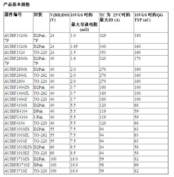 IR 亞洲區銷售副總裁潘大偉表示:“IR 這些經過優化的汽車專用MOSFET具有低導通電阻,具有寬泛的電壓和封裝。由於其表麵形成了鈍化層,因而可以提高可靠性。此外,該器件的材料經過調整、優化後可達到堅固、耐用的效果。”