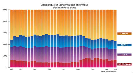 從全球前5位芯片供應商總計,從1960年以來變化很小, 都在33%左右,1972年時小於35%。如果再依前十位總計, 變化也很少, 從1972年的48%,到2008年的46%。
