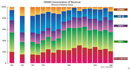 能夠看到的兼並主要集中在半導體的製造部分, 如在存儲器DRAM, 尤其是近10年來。從數據看DRAM供應商中, 前1, 前3及前5及前10位從進入新世紀以來它們的份額都在減少, 實際上近25年來它們己進行了多次兼並。從1983年計(公司剛開始有DRAM數據)DRAM的前1, 前3及前5的市場份額幾乎未變, 而依前10計, 比1983年時還稍少了一些。