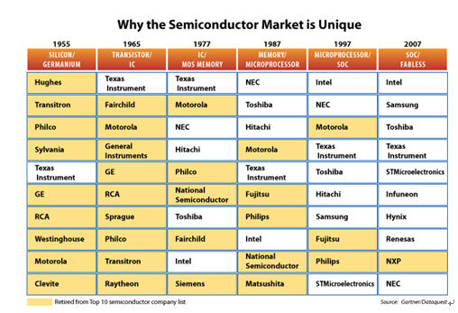 在半導體業中要實現領先地位, 保持增長, 爭得更大的市場份額依靠的是最先進技術的推動,但是隻有少數公司能做到這一點。在1950年能進入前10, 意味著是鍺或矽晶體管的領導者。在1960年代, 能夠維持增長並領先是依靠雙極型集成電路技術, 在該10年中, 排在前10名中的公司有40%消失, 而到1970年代,其中的80%也消失了。在70年代時, 是依靠MOS存儲器來推動增長, 當時日本有三家公司,NEC,Hitachi及Toshiba進入前10。到1980及1990年代, 排在首位是依靠微處理器, 如英特爾與Motorola。在1990年代, 情況有所變化, SoC的領導者, 如STMicroelectronics及TI進入前10。而到最近10年中,fabless公司如Qualcomm及代工大亨TSMC進入前10中。