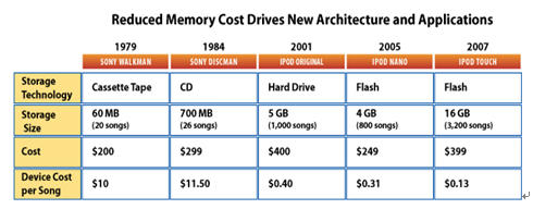 在如此高的累積數量增長下推動學習曲線的成本下降,在過去10年中每年晶體管的成本下降35%及總體上能使新的應用市場達到規模化。如2001年的MP3播放機的價格與今天的攝像機相同, 而今天攝像機中用的存儲器容量增長了10倍, 而且與2001年時的尺寸及功耗幾乎相同。