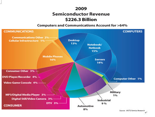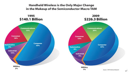 那麼未來將會是怎麼樣呢?隻zhi要yao晶jing體ti管guan的de數shu量liang按an目mu前qian的de高gao增zeng長chang倍bei率lv繼ji續xu走zou下xia去qu,各ge種zhong新xin的de應ying用yong會hui層ceng出chu不bu窮qiong,推tui動dong半ban導dao體ti市shi場chang總zong量liang進jin一yi步bu提ti高gao。因yin此ci全quan球qiu半ban導dao體ti市shi場chang在zai近jin15年來看似十分穩定,雖然如台式計算機市場已經飽和,但是筆記本電腦和上網本開始流行,加上消費類電子產品如遊戲機,平板電視,MP3, 數碼相機等, 由於半導體含量的增加推動了半導體TAM的增加。