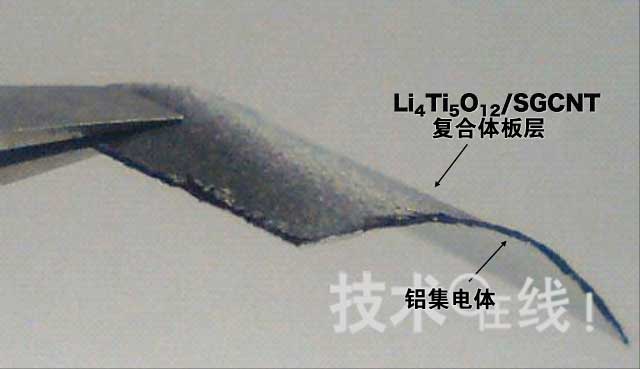 此次發布的鋰離子電容器的最大特點是,雖然采用含有率高達80~85%的LTO,仍確保了電子的導電通路。因此,“即使在300C的高倍率下放電,電容維持率仍相當高”(東京農工大學大學院教授直井勝彥)(圖2)。負極采用2004年通過NEDO項目“納米碳應用產品創製項目”開發出的“Super Growth法”單層碳納米管(SGCNT),取代了CNF。東京農工大學稱,如果采用該大學開辦的風險企業K & Double(音譯)開發的超離心處理技術來製作比表麵積較大的SGCNT以及LTO,則可將粒徑非常小、隻有1~10nm的LTO牢固地載置於SGCNT的外壁及內壁上(圖3)。而且,該大學還成功地製作出了不含導電助劑及粘結劑(Binder)的板層(Sheet)電極(圖4)。