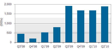 圖一:從Q3’08到Q2’10應用於電子書電子紙出貨量 (單位 :千片)