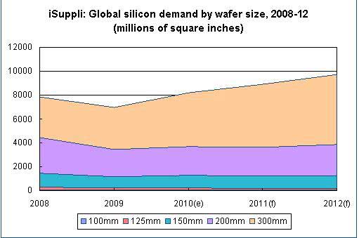 iSuppli:2008年至2012年,全球不同尺寸半導體矽片市場需求量狀況