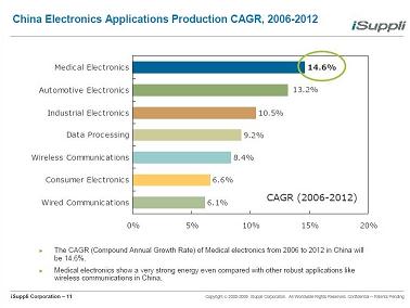 “醫療電子市場的年複合增長率在所在領域中最高,達14.6%,超過目前也是很火的汽車電子、無線通信等領域,所以大家可以想象它為什麼吸引眾多觀眾。”iSuppli資深分析師王仁震解釋,“而中國醫療電子市場占全球的比例也是逐年增長,2006年隻占到4%,但2013年可達到9%的比重。”